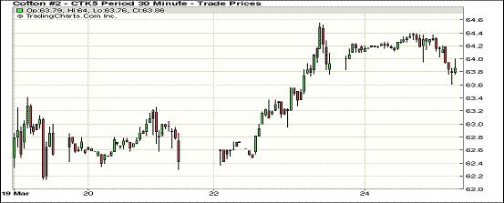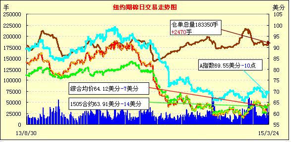 3月24日紐約近月合約小幅回落,但大部分合約依然保持漲勢(shì);主力1505月合約結(jié)算價(jià)63.91美分/磅,跌14點(diǎn),1507月合約收于64.38美分/磅,跌4點(diǎn)。當(dāng)日市場(chǎng)買盤冷卻,主力合約早盤上漲,但隨后結(jié)束上漲趨勢(shì)并小幅收跌,跌幅0.22%。5/7月合約價(jià)差47點(diǎn)。