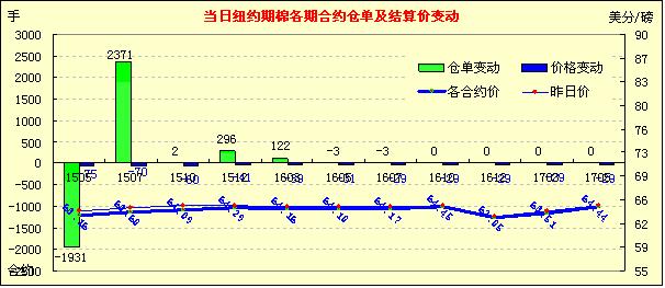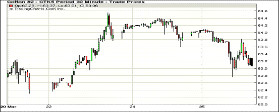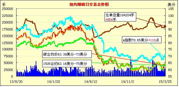 3月25日紐約期棉全線下跌,主力合約收于當(dāng)日低位;主力1505月合約結(jié)算價63.16美分/磅,跌75點(diǎn);遠(yuǎn)期1507月合約收于63.68美分/磅,跌70點(diǎn)。當(dāng)日主力合約震蕩幅度較大,開盤后即開始下跌,早盤保持在63.80美分左右,最高/最低價相差133點(diǎn),午后反彈失敗,全天跌幅1.17%。7/12月合約價差61點(diǎn)。