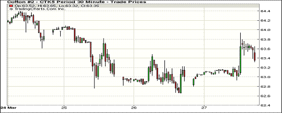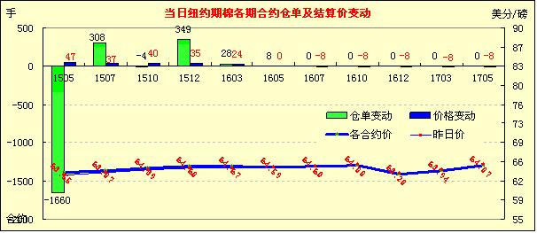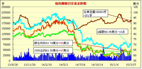 本周最后一個(gè)交易日,紐約期棉近漲遠(yuǎn)跌,主力合約小幅反彈;1505月合約結(jié)算價(jià)63.55美分/磅,漲47點(diǎn),1507月合約收于63.87美分/磅,漲37點(diǎn)。當(dāng)日早盤合約價(jià)走勢平緩,成交量一般,但午后沖高,并在短時(shí)間內(nèi)上漲至當(dāng)日最高價(jià)63.94美分/磅,之后回落,全天漲幅0.74%。5/7月合約價(jià)差52點(diǎn)。