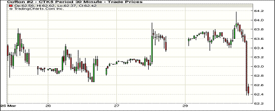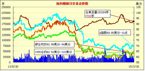 周一美元指數(shù)上漲,紐約期棉承壓下挫,全線飄綠;主力1505月合約結(jié)算價62.521美分/磅,跌103點;遠期1507月合約收于63.00美分/磅,跌87點。當日主力合約平開,全天走勢小幅震蕩,上行空間較小,最高價64.18美分/磅,臨近收盤時跳水下跌,收盤價僅高于最低價15點。7/12月合約價差49點。