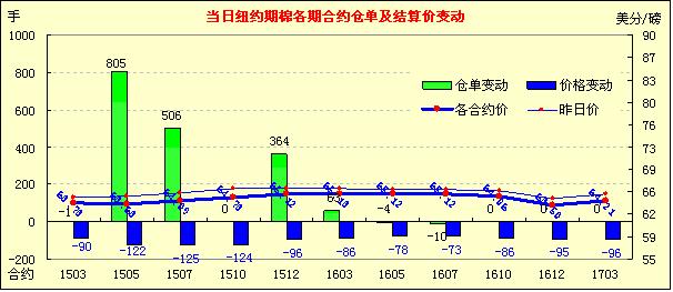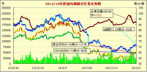 3日,受市場(chǎng)買(mǎi)盤(pán)減少和全球需求下降等因素影響,紐約期棉各合約普遍收跌;近期3月合約收于63.73美分/磅,跌90點(diǎn);主力1505月合約63.63美分/磅,跌122點(diǎn)。當(dāng)日期棉開(kāi)盤(pán)后承壓下挫,主力合約跌破64美分/磅點(diǎn)位,連續(xù)四個(gè)交易日收跌,當(dāng)日跌幅超百點(diǎn),市場(chǎng)成交量小幅上升,外部商品市場(chǎng)漲跌不一。