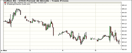 3月5日,紐約期棉在USDA美棉出口報(bào)告數(shù)據(jù)發(fā)布后快速下跌,中國(guó)大量取消訂單暫時(shí)對(duì)棉價(jià)形成壓力,期棉各合約普遍收跌;近期3月合約收于63.21美分/磅,跌40點(diǎn);主力1505月合約63.23美分/磅,跌37點(diǎn)。當(dāng)日主力5月合約開盤后在63美分/磅點(diǎn)位波動(dòng)調(diào)整,盤終整體收跌,過去11個(gè)交易日9次收陰,在2月25日收于65.55美分上方后不斷下滑。在2.20-2.26一周美國(guó)凈簽約出口本年度陸地棉14175噸;裝運(yùn)81828噸;其中中國(guó)大量取消陸地棉訂單(25855噸),對(duì)棉價(jià)形成壓力,不過美棉整體銷售正常,后期棉價(jià)仍有上漲動(dòng)力。