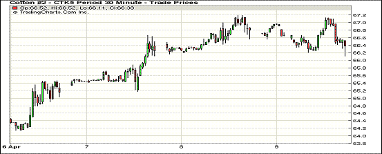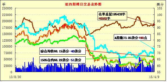 4月9日,紐約期棉近月合約小幅回落;1505月合約結(jié)算價(jià)66.22美分/磅,跌51點(diǎn),1507月合約收于66.13美分/磅,跌33點(diǎn)。當(dāng)日主力合約高開后下跌,盤中跌入最低點(diǎn)66.11美分/磅,但當(dāng)日震蕩幅度不大,最高價(jià)依然在67美分以上。7/12月合約價(jià)差9點(diǎn)。最新美棉出口量繼續(xù)減少,裝運(yùn)量和皮馬棉簽約量均創(chuàng)年度新高,之后美國(guó)農(nóng)業(yè)部供需平衡表發(fā)布,小幅上調(diào)美棉產(chǎn)量和年末庫(kù)存。