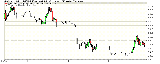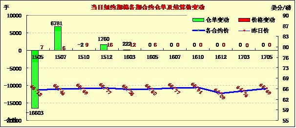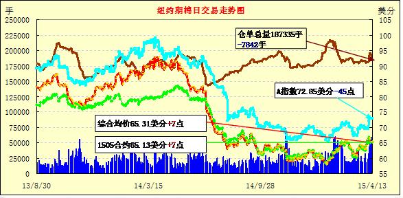 截止4月13日美棉播種進度依然停留在2%,受天氣影響推遲,紐約期棉止跌;近月1505月合約結(jié)算價65.13美分/磅,漲7點;主力1507月合約收于65.46美分/磅,漲6點。當日主力合約低開,早盤震蕩下跌,最低價64.95美分/磅,之后反彈上漲,最高價65.84,全天震蕩區(qū)間不足100點。7/12月合約價差31點。在連續(xù)兩日下跌后,周一紐約期棉止跌企穩(wěn),截至2014/15美棉簽約量進度已達100%。但有呼吁加大印度競賣拋售力度,中國本年度是否拋儲尚無結(jié)論,因此期棉反彈基礎(chǔ)不足。