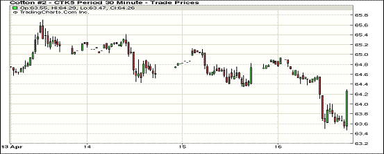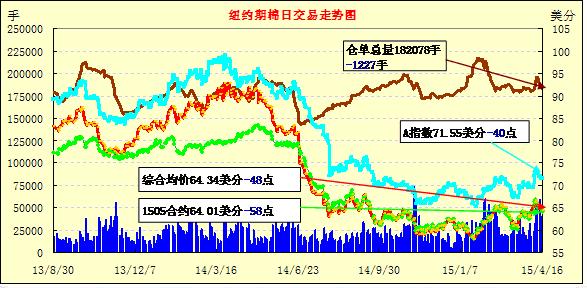 周四,除1612和1703合約外,紐期價格繼續(xù)下跌,主力合約收盤價創(chuàng)近八個交易日來最低;1505月合約結(jié)算價64.01美分/磅,跌58點;1507月合約收于64.58美分/磅,跌42點。當(dāng)日主力合約全天走勢以下跌為主,并一度跌破64美分/磅一線,臨收盤時反彈沖高,但最終依然收跌,跌幅-0.64%。7/12月合約價差4點。上周美棉出口數(shù)據(jù)不利,中國取消大量簽約,市場信心受挫。