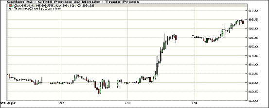本周最后一個(gè)交易日紐約期棉將前一日漲勢進(jìn)一步延續(xù),1505月合約結(jié)算價(jià)66.50美分/磅,漲191點(diǎn);1507月合約66.34,漲89點(diǎn);1512月合約65.62美分/磅,漲48點(diǎn)。24日,紐約期棉主力7月合約整日交易重心向上,早盤在65.5美分一線盤整,交易中期受投機(jī)買盤支持挑戰(zhàn)66美分成功,后期穩(wěn)定于該水平之上,終收于近高點(diǎn)。分析師指出,市場連續(xù)上漲的動能主要來自周四美棉出口周報(bào)的利好。