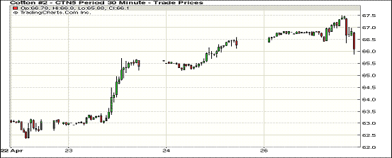 4月27日,紐約期棉主力7月合約小幅高開(kāi),上半場(chǎng)交易穩(wěn)定于66.8美分一線(xiàn)波動(dòng),交易中期上攻67美分,最高走至67.6美分(+110點(diǎn)),交易后期受獲利了結(jié)盤(pán)打壓吐盡整日漲幅以小跌收盤(pán)。受美棉出口強(qiáng)勁勢(shì)頭推動(dòng),紐約期棉重心依舊向上,12月合約在突破66美分后有望上攻68美分。