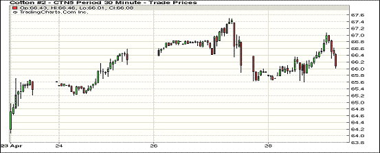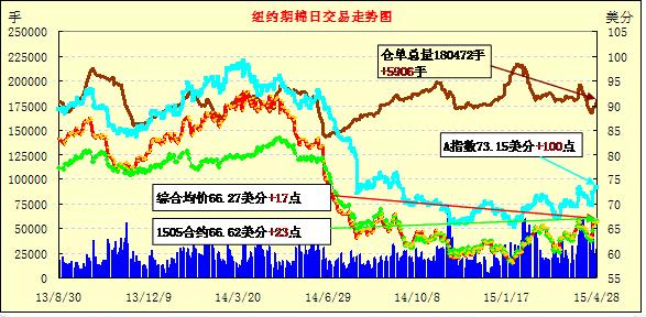 4月28日美元兌主要貨幣跌至八周低位,主要商品價格普漲帶動紐約期棉;1505月合約結(jié)算價66.62美分/磅,漲23點;主力1507月合約收于66.39美分/磅,漲16點。當日7月合約低開,早間跌至65.60美分,下午走勢較強,一度突破67美分,最高價67.07美分/磅,盤尾受賣盤影響回落,全天漲幅僅0.24%。7/12月合約價差54點。
