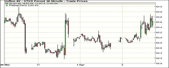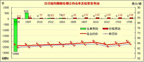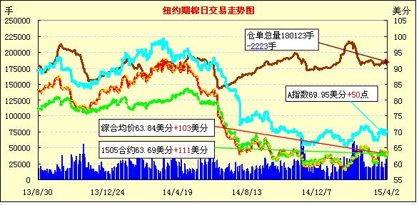 4月2日紐約期棉全線飄紅,主力合約和遠(yuǎn)期合約漲幅較大;1505月合約結(jié)算價(jià)62.58美分/磅,跌52點(diǎn),1507月合約收于62.93美分/磅,跌53點(diǎn)。當(dāng)日主力合約平開,之后一路震蕩上行,最低價(jià)為開盤價(jià)62.58美分/磅,最高價(jià)僅低于周二的最高價(jià)63.94美分/磅。全天漲幅1.77%。7/12月合約價(jià)差74點(diǎn)。昨美棉出口數(shù)據(jù)發(fā)布,截至3月26日美棉簽約量已達(dá)美農(nóng)業(yè)部預(yù)測(cè)全年出口量的98%,當(dāng)周裝運(yùn)量為年度第二。