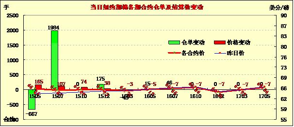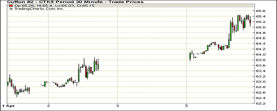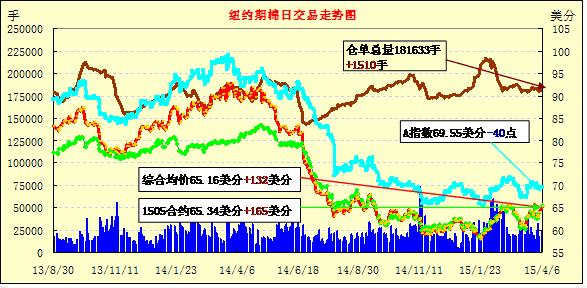 4月6日紐約期棉近漲遠(yuǎn)跌,5/7月合約上漲超100點(diǎn);1505月合約結(jié)算價65.34美分/磅,漲165點(diǎn),1507月合約收于64.87美分/磅,漲107點(diǎn)。當(dāng)日主力合約高開后下跌,并很快跌入當(dāng)日最低價63.75美分/磅,之后震蕩上漲,最高價65.46美分/磅,略高于收盤價。全天漲幅2.59%。7/12月合約價差15點(diǎn)。截至目前美棉種植者簽約植棉面積僅為預(yù)計種植面積的1%,德州Rio Grande種植區(qū)潮濕影響種植,陸地棉貸款下跌13萬包。