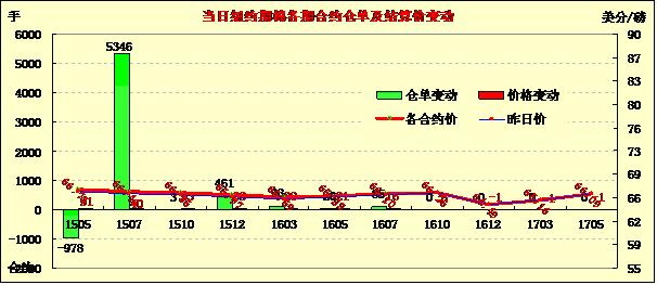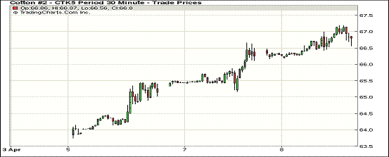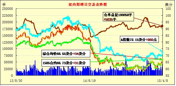 4月8日,紐約期棉第四日上漲,成交量為去年9月12日以來最高,5/7月合約當日最高價均突破67美分;1505月合約結算價66.73美分/磅,漲31點,1507月合約收于66.46美分/磅,漲40點。當日主力合約平開后穩(wěn)步上漲,午后震蕩幅度稍大,最低價66.16美分/磅,最高價67.19美分/磅。全天漲幅0.47%。7/12月合約價差27點。8日美棉繼續(xù)上漲,但近67美分阻力線,上漲乏力。美國農業(yè)部預測阿肯色州植棉面積為23萬英畝,較本年度減少31%,全國范圍內植棉面積為954.9萬英畝,僅為本年度的87%。
