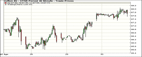 4月30日美棉出口消息利好,商業(yè)買盤增加,紐約期棉再次收高,主力合約當(dāng)月漲幅7.86%;1505月合約結(jié)算價68.12美分/磅,漲80點;1507月合約收于67.88美分/磅,漲79點。當(dāng)日主力合約高開高走,全天震蕩空間較小,最高價68.07美分/磅,盤尾回落,全天漲幅1.17%。7/12月合約價差124點。美棉出口銷售超出預(yù)期,下半年皮棉供應(yīng)緊缺基本成定局,新花播種進(jìn)度依舊遲緩,阿肯色播種僅5%,較去年同期的13%大大落后。
