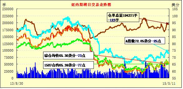 周一美元指數(shù)走強(qiáng),外部市場(chǎng)普遍收跌,紐約期棉全線下跌;1507月合約結(jié)算價(jià)65.39美分/磅,跌77點(diǎn);1512月合約收于65.18美分/磅,跌66點(diǎn)。當(dāng)日主力合約早盤即開(kāi)始走低,后半場(chǎng)交易在64.60至65.40美分/磅區(qū)間震蕩,并兩次接近最低價(jià),盤尾小幅拉升,但最終收跌,跌幅1.16%。7/12月合約價(jià)差21點(diǎn)。周一紐約期棉收于兩周來(lái)最低價(jià),周二美國(guó)農(nóng)業(yè)部即將發(fā)布最新供需平衡表,預(yù)測(cè)下年度新花產(chǎn)量在1405萬(wàn)包,較2014/15年度減14%,本年度產(chǎn)量稍有調(diào)減。