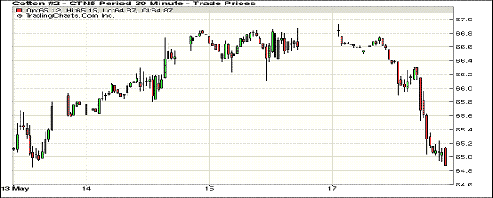 5月18日賣盤壓力重現(xiàn),紐約期棉全線大跌,主力合約下跌近200點(diǎn);1507月合約結(jié)算價(jià)64.92美分/磅,跌192點(diǎn);1512月合約收于65.18美分/磅,跌164點(diǎn)。當(dāng)日主力合約早盤跌勢(shì)較緩,下半場交易兩次直線下跌,最終收于當(dāng)日低位,跌幅近3%。7/12月合約價(jià)差26點(diǎn)。