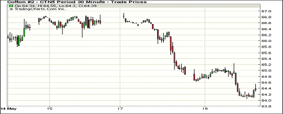 5月19日紐約期棉重回調(diào)整狀態(tài),合約遠(yuǎn)漲近跌;1507月合約結(jié)算價(jià)64.35美分/磅,跌57點(diǎn);1512月合約收于64.83美分/磅,跌35點(diǎn)。當(dāng)日,主力合約低開后走勢(shì)平緩,后半場交易開始下行,最低價(jià)64.51美分/磅,收盤時(shí)小幅回升,跌幅0.88%。7/12月合約價(jià)差48點(diǎn)。