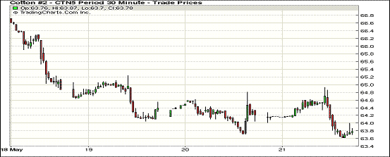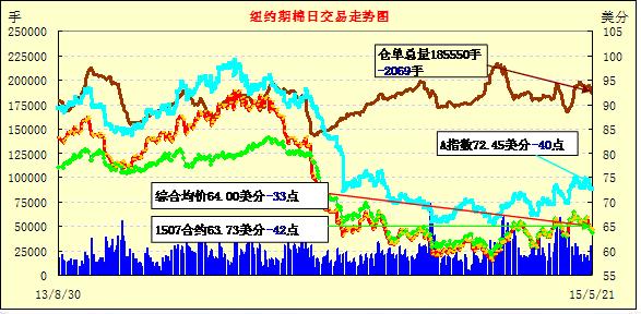 5月21日出口數(shù)據(jù)保持強勁,但紐約期棉跌勢不改,主力合約跌破64美分;1507月合約結(jié)算價63.73美分/磅,跌42點;1512月合約收于64.70美分/磅,漲27點。當日主力合約繼續(xù)下挫,上半場交易在64.10-64.60美分/磅之間浮動,下半場交易沖至高點后下跌,最終收于低位。日前有傳言稱印度競賣將面向世界各個國家和地區(qū),但價格依然不降。但由于對印度和中國儲備政策的擔憂,多頭受到牽制,棉價繼續(xù)下跌。