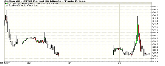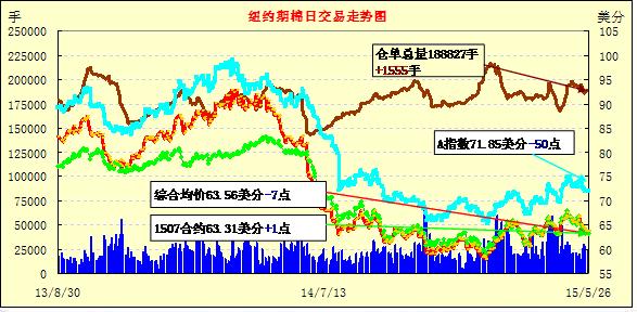5月26日紐約期棉繼續(xù)保持弱勢,除7月外,其他合約小幅下跌;1507月合約結(jié)算價63.31美分/磅,漲1點;1512月合約收于64.08美分/磅,跌30點。當日主力合約開盤后微幅向下震蕩,午盤向上拉升沖高,最高價64.66美分/磅,但隨后回落,收盤時僅上漲1點,基本保持不變。