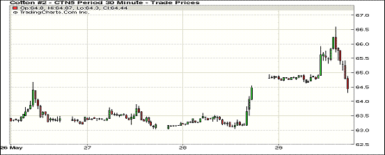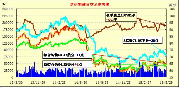 5月29日紐約期棉沖高回落,但主力合約保持上漲;1507月合約結(jié)算價(jià)64.35美分/磅,漲2點(diǎn);1512月合約收于64.64美分/磅,跌42點(diǎn)。最新美棉出口支撐紐約期棉在繼續(xù)上漲,主力7月合約最高至66.59美分/磅,尾盤遭受多單獲利平倉(cāng)賣盤打壓而回吐漲幅。漲幅0.03%。7/12月合約價(jià)差29點(diǎn)。周五公布的美棉出口報(bào)告顯示5月15-21日美棉出口激增,為117500包,較上周增98%;裝運(yùn)339200包,基本同上周持平。