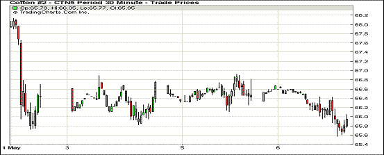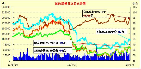 由于市場對美棉簽約取消的擔(dān)憂,5月6日紐約期棉承壓下跌;1505月合約結(jié)算價(jià)66.10美分/磅,跌89點(diǎn);1507月合約收于65.86美分/磅,跌89點(diǎn)。受賣盤壓力影響,當(dāng)日主力合約低開低走,全天以下行為主要趨勢,少有上浮,跌幅1.34%,7/12月合約價(jià)差9點(diǎn)。市場擔(dān)憂美棉簽約進(jìn)一步取消,賣盤壓力較大導(dǎo)致當(dāng)日期棉下跌。