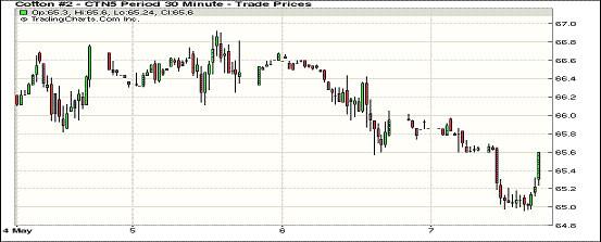 5月7日美元指數(shù)走強(qiáng),整體外部市場弱勢,紐約期棉繼續(xù)小幅下跌;1507月合約結(jié)算價65.53美分/磅,跌33點(diǎn);1512月合約收于65.43美分/磅,跌34點(diǎn)。當(dāng)日主力合約高開,全天大部分時間走勢平穩(wěn),午間下跌后在低位保持,收盤前拉升反彈,跌幅0.50%。7/12月價差10點(diǎn)。