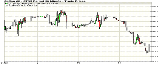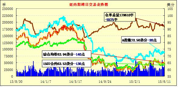 6月11日,受中國(guó)拋儲(chǔ)傳言影響紐約期棉全線大幅下跌;1507月合約結(jié)算價(jià)63.53美分/磅,跌136點(diǎn);1512月合約收于64.38美分/磅,跌142點(diǎn)。當(dāng)日全天主力合約走勢(shì)以下跌為主,僅盤中和盤尾兩次上升反彈,跌幅2.14%。7/12月合約價(jià)差85點(diǎn)。由于中國(guó)拋儲(chǔ)、印度CCI降價(jià)銷售等市場(chǎng)傳言影響,紐約期棉周四大幅下跌,此外當(dāng)日美元指數(shù)走強(qiáng)。