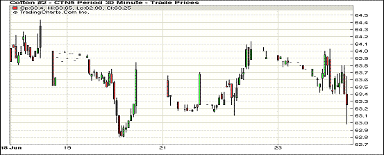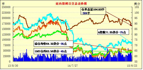 6月23日期棉回吐周一部分漲幅,合約價(jià)全部收跌;1507月合約結(jié)算價(jià)63.58美分/磅,跌45點(diǎn);1512月合約收于64.55美分/磅,跌25點(diǎn)。當(dāng)日主力12月合約高開(kāi)低走,早間交易相對(duì)平穩(wěn),下半場(chǎng)交易時(shí)達(dá)到最高點(diǎn)后跳水,收盤(pán)時(shí)略有回升。跌幅0.39%。7/12月合約價(jià)差繼續(xù)擴(kuò)大,至97點(diǎn)。據(jù)美國(guó)農(nóng)業(yè)部美棉苗情報(bào)告,截至本周美棉播種進(jìn)度為94%,預(yù)計(jì)本年度美棉種植面積將低于預(yù)測(cè);另一方面,CCI始終不降價(jià)銷(xiāo)售,中國(guó)國(guó)儲(chǔ)棉也承諾不打壓市場(chǎng)。因此期棉短期內(nèi)雖難有起色,但后市有望走強(qiáng)。