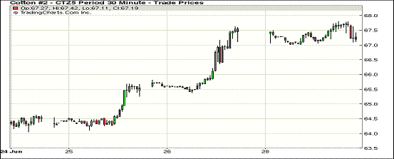 6月29日,紐期價格略有下跌,但幅度較??;1507月合約結算價66.80美分/磅,跌36點;1512月合約收于67.23美分/磅,跌28點。當日主力合約早間交易在67.00至67.40美分/磅之間浮動,下半場交易總體走勢較強,但最終沖高回落。跌幅0.42%。7/12月合約價差43點。美元升值給商品價格帶來壓力,紐約期棉承壓下跌,分析師指出,年度末市場遭受印度與中國的拋儲壓力,突破68.5美分/磅的概率較小。