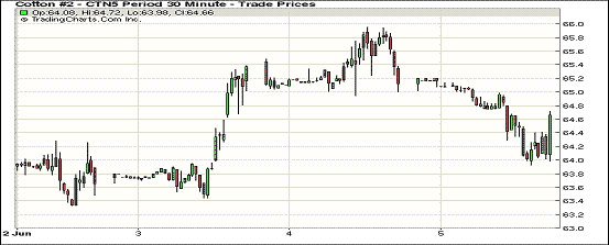 6月5日因美元指數(shù)走強(qiáng),紐約期棉以大跌收盤,1507月合約結(jié)算價(jià)64.01美分/磅,跌111點(diǎn);1512月合約收于64.55美分/磅,跌73點(diǎn)。當(dāng)日,近期7月合約交易整日重心向下,早盤短暫停留在65美分后盤中下跌,交易后期在64美分處獲得支撐,主力12月合約在64.5美分尋找支持,最終收于近低點(diǎn)。美指數(shù)走強(qiáng)及有一只大型指數(shù)基金移倉導(dǎo)致當(dāng)日7月合約大跌;12月合約下一步將試探63.85美分支撐位。