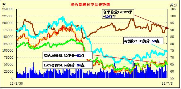 7月8日,受外圍市場(chǎng)影響,紐期連續(xù)第五日收跌;1507月合約結(jié)算價(jià)64.59美分/磅,跌94點(diǎn);1512月合約收于65.30美分/磅,跌66點(diǎn)。當(dāng)日主力合約全天承壓走勢(shì)低迷,震蕩區(qū)間僅87點(diǎn),成交相對(duì)遲滯。當(dāng)日跌幅1.00%,7/12月合約價(jià)差71點(diǎn)。當(dāng)日外圍市場(chǎng)壓力較大,主要有中國(guó)股市和期貨市場(chǎng)下跌,中國(guó)現(xiàn)貨下跌,其他美元計(jì)價(jià)商品也呈弱勢(shì)。