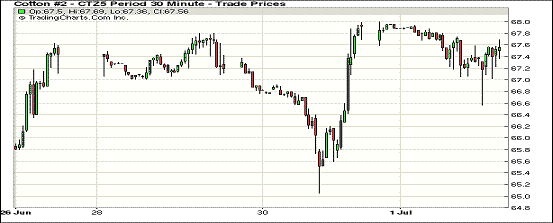 7月1日,美元指數(shù)上漲壓制商品價(jià)格,期棉漲跌互現(xiàn);1507月合約結(jié)算價(jià)66.09美分/磅,跌142點(diǎn);1512月合約收于67.54美分/磅,跌37點(diǎn)。當(dāng)日主力合約全天震蕩下行,最低創(chuàng)66.56美分/磅,收盤前略有反彈,但依然收跌。當(dāng)日跌幅0.55%,7/12月合約價(jià)差154點(diǎn)。市場依舊關(guān)注年末庫存,中印儲(chǔ)備棉流入市場,但消費(fèi)不變,紗價(jià)因此維持弱勢,期棉漲幅有限。