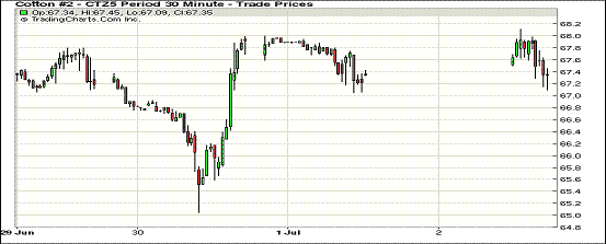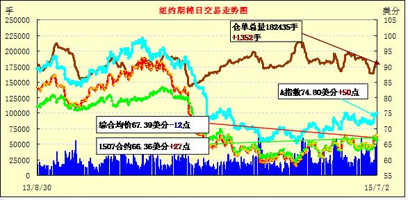 7月2日,美棉出口及裝運(yùn)利好,期棉沖高回落;1507月合約結(jié)算價66.36美分/磅,漲27點(diǎn);1512月合約收于67.39美分/磅,跌15點(diǎn)。當(dāng)日主力合約早間走勢較弱,多次下探67.00美分一下,下半場交易沖高,最高價68.11美分/磅,最終回落收跌,跌幅0.22%。7/12月價差103點(diǎn)。年度末期美棉出口數(shù)據(jù)依然保持利好,出口已超出預(yù)計的8%,這將大幅下調(diào)美棉年末庫存。