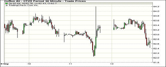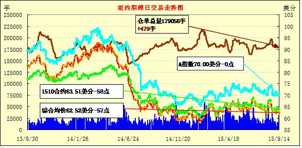 9月14日,中國8月制造業(yè)指數(shù)下跌,引發(fā)投資者對中國經(jīng)濟的擔憂,中美股市下跌,此外USDA上調(diào)2015/16年度美棉產(chǎn)量7.6萬噸,多方不利因素造成ICE期棉下跌;主力12月合約結(jié)算價62.55美分/磅,跌58點,1603月合約62.33美分,跌58點。當日主力合約早間交易上漲,但之后在賣盤壓力下受挫,最高價63.70美分/磅,最低價62.43美分/磅。受8月PMI指數(shù)影響目前市場情緒相對低落,但未來美棉上市和印度棉花公司收購將繼續(xù)提供支撐,棉價下跌空間有限。