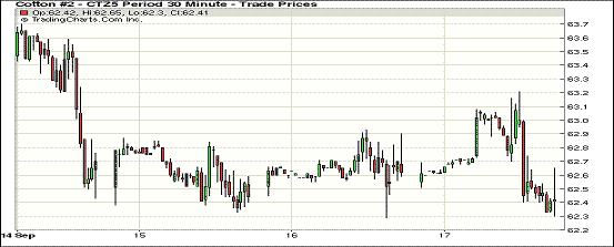 17日美聯(lián)儲(chǔ)宣布推遲加息,美元跳水,但紐約期棉下跌,收盤價(jià)創(chuàng)8月以來最低;1512月合約結(jié)算價(jià)62.40美分/磅,跌31點(diǎn),1603月合約62.22美分,跌20點(diǎn)。周四12月合約低開,早間交易上漲,最高價(jià)63.21美分/磅,此后開始長達(dá)4小時(shí)的弱勢(shì)走勢(shì),收盤前十分鐘回升。周四美聯(lián)儲(chǔ)表示暫不加息,同時(shí)美棉出口保持良好,截至上周美棉簽約出口已達(dá)297.8萬包,USDA預(yù)測(cè)的30%,裝運(yùn)71萬包,較去年同期大幅減少。
