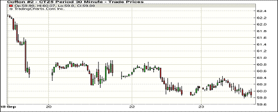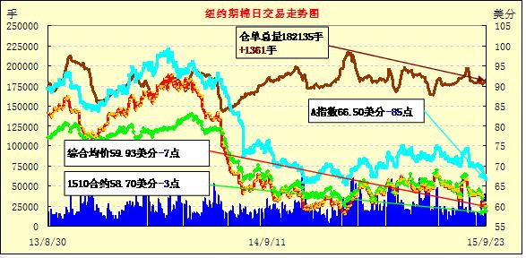 9月23日美元繼續(xù)升值,大宗商品承壓走軟;1512月合約結(jié)算價(jià)59.97美分/磅,跌3點(diǎn);1603月合約收于59.63美分/磅,跌26點(diǎn)。當(dāng)日紐約期棉主力合約低開(kāi),并于61美分/磅以下震蕩整理,早間交易走勢(shì)較強(qiáng),最高60.44美分/磅,隨后回歸弱勢(shì)。目前市場(chǎng)焦點(diǎn)集中在中國(guó)的經(jīng)濟(jì)與需求問(wèn)題上漲,從美棉銷售數(shù)據(jù)來(lái)看,中國(guó)買家基本放棄了采購(gòu)美棉,美棉銷售壓力增加是其價(jià)格維持跌勢(shì)的主要原因,但新年度全球及主要產(chǎn)棉國(guó)減產(chǎn)及印度收儲(chǔ)政策有望對(duì)棉價(jià)形成支撐,下行空間有限,關(guān)注58美分/磅強(qiáng)支撐位。