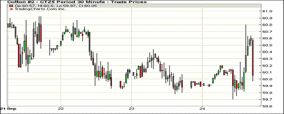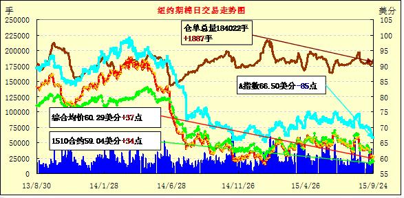 最新美棉簽約量保持在2萬噸以上,紐約期棉小幅收漲;1512月合約結算價60.31美分/磅,漲34點;1603月合約收于60.12美分/磅,漲49點。24日早間主力12月合約低開后平穩(wěn)上漲,下半場交易時起伏較大,收盤前沖高回落,最終漲幅0.57%。目前全球經濟增長不確定性依然是影響下半年消費的主要因素,周四美國道瓊斯指數、標普和納斯達克均收跌,中國經濟增速放緩,截止9月底印度CCI2014/15年度收購庫存依然有30余萬噸,即使新年度印度繼續(xù)收購,將對棉價提供有限支撐。