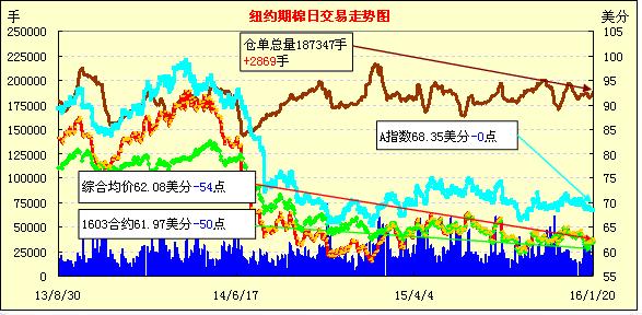 周三國際油價暴跌拖累紐約期棉,1603月合約結(jié)算價61.97美分/磅,跌50點(diǎn),1605月合約62.28美分/磅,跌46點(diǎn)。當(dāng)日早盤主力合約成交量少,走勢起伏較小。后合約價賣盤壓力影響下走低,收盤前略有回升。本年度美棉銷售進(jìn)度整體緩慢,12月中國進(jìn)口數(shù)據(jù)同比繼續(xù)下降,棉花自身基本面無明顯利好改善,預(yù)計(jì)后市大漲的可能不大,棉價或維持低位調(diào)整。