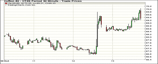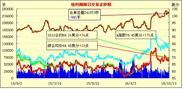 13日,紐約期棉延續(xù)漲勢(shì),但上漲幅度不如前一日大,近期12月合約結(jié)算價(jià)69.31美分/磅,漲34點(diǎn),1703月合約69.74美分,漲35點(diǎn)。12月合約小幅低開(kāi),最低跌回前一日上漲之前水平,但盤中受谷物期貨市場(chǎng)上漲及USDA(美國(guó)農(nóng)業(yè)部)月報(bào)效應(yīng)支持,最高沖破70美分防線,交易后期回吐部分漲幅,終以小幅上漲收盤。