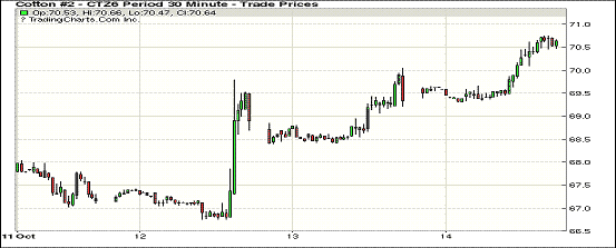 14日,紐約期棉市場因美棉出口周報利好刺激發(fā)力大幅收漲,近期12月合約結(jié)算價70.57美分/磅,漲126點,1703月合約70.89美分,漲11點。當(dāng)日市場穩(wěn)定開盤,盤中窄幅盤整,交易后期在美棉出口周報發(fā)布后,買盤獲得動能炒高,市場突破70美分后最高接近71美分,最終將漲勢保留到收盤。據(jù)美國農(nóng)業(yè)部(USDA),9.30-10.6一周美國凈簽約出口2016/17年度陸地棉51460噸,較前周增43%,較近四周平均增55%。