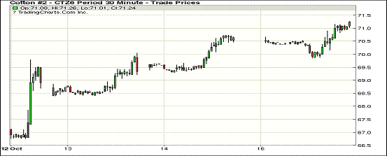 本周第一個交易日美元指數(shù)下跌,紐約期棉繼續(xù)上漲,1612合約收于71.19美分/磅,漲62點;1703合約收于71.49美分/磅,漲60點。當(dāng)日主力合約開盤后走勢平穩(wěn)并略有下跌,但很快在買盤支撐下走高,當(dāng)日主力合約最高價71.26美分/磅,最終收于交投區(qū)間高位。本周美棉采摘進度30%,較上周增8個百分點;美國15個棉區(qū)平均吐絮89%,較上周增9個百分點;不正常的苗情17%,較上周增加1%。