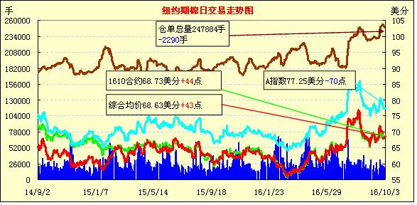 周一外部市場(chǎng)上漲帶動(dòng)紐約期棉小幅走高;1612合約收于68.52美分/磅,漲44點(diǎn);1703合約收于69.01美分/磅,漲47點(diǎn)。當(dāng)日主力合約開(kāi)盤(pán)后微幅下跌,近月合約整體走弱,盤(pán)中買(mǎi)盤(pán)介入,支撐價(jià)格上漲。至本周,美棉采摘進(jìn)度16%,較上周增6個(gè)百分點(diǎn),略高于去年同期和近五年平均。颶風(fēng)“馬修”即將登陸加勒比海沿岸國(guó)家,可能對(duì)美國(guó)南部棉區(qū)造成影響。