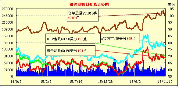 上周美棉簽約出口較前周和近四周平均簽約增加,紐約期棉上漲;1612合約收于69.20美分/磅,漲91點;1703合約收于69.83美分/磅,漲97點。當日新花3月合約得到支撐上漲,最高價突破70美分一線,后半天交易時合約回落,但依然處于震蕩區(qū)間上部。至11月3日,美國陸地棉簽約達到USDA預測出口總量的56%,領先去年同期。