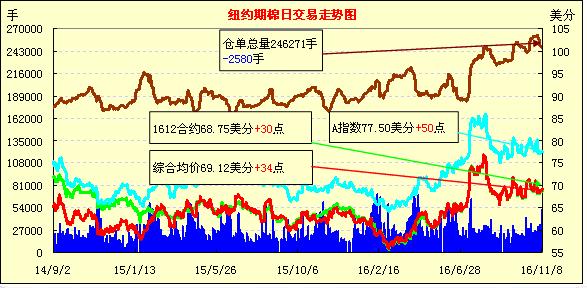 周二市場關(guān)注美國農(nóng)業(yè)部月度報告,紐約期棉小幅上漲;1612合約收于68.75美分/磅,漲30點;1703合約收于69.24美分/磅,漲24點。當(dāng)日主力合約開局走高,并突破了69美分,之后合約價回落但全天大部分時間依然保持在較高水平。USDA預(yù)測發(fā)布前夕,市場預(yù)計本次預(yù)測將下調(diào)美棉產(chǎn)量,有其他機構(gòu)預(yù)測美棉產(chǎn)量在1598萬包,低于10月美國農(nóng)業(yè)部預(yù)測的1603萬包。