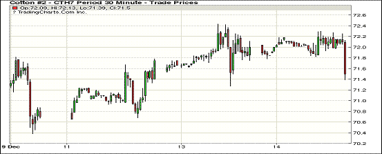 周三紐約期棉回落,成交量萎縮;1703合約收于71.47美分/磅,跌57點(diǎn);1705合約收于71.64美分/磅,跌56點(diǎn)。當(dāng)日主力合約開市后下跌,隨后小幅上漲,并在當(dāng)日大部分時(shí)間走勢平穩(wěn),收盤前賣盤壓力增加走低,合約最終收跌。14日美聯(lián)儲(chǔ)宣布加息,美元匯率上升,美股和商品價(jià)格走低。