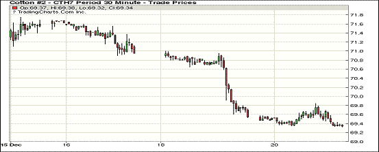 周二紐約期棉延續(xù)前一交易日跌勢(shì),但跌幅較小;1703合約收于69.34美分/磅,跌23點(diǎn);1705合約收于69.77美分/磅,跌26點(diǎn)。當(dāng)日主力合約震蕩幅度在前一交易日內(nèi),僅52點(diǎn),整體走勢(shì)相對(duì)平穩(wěn),成交量減少。因圣誕節(jié)前投資者清結(jié)多頭頭寸,周二紐約期棉繼續(xù)承壓。節(jié)后中國(guó)即將進(jìn)入春節(jié)假期,棉價(jià)可能延續(xù)此前的低迷走勢(shì)。
