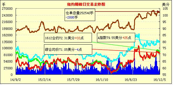 周一紐約期棉微幅調(diào)整,成交量小;1612合約收于72.31美分/磅,漲33點(diǎn);1703合約收于71.01美分/磅,跌3點(diǎn)。當(dāng)日3月合約震蕩區(qū)間縮小,全天在周五交投區(qū)間內(nèi)波動(dòng),投資者大部分時(shí)間處于觀望狀態(tài),合約走勢(shì)缺乏方向。目前中國(guó)和印度新花上市量逐漸上升,美棉增產(chǎn)壓力顯現(xiàn),市場(chǎng)關(guān)注周五美國(guó)農(nóng)業(yè)部預(yù)測(cè)的發(fā)布,觀望情緒較濃。