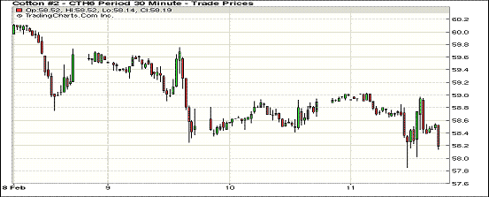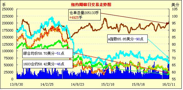 2月11日紐約期棉市場再度下跌,1603月合約結(jié)算價58.42美分/磅,跌46點;1605月合約收于58.71美分/磅,跌52點。當日市場轉(zhuǎn)倉交易活躍,成交量維持在6萬手以上。3月合約在弱勢開盤后盤中大幅下跌,最低點57.85美分/磅,為該合約歷史最低位,交易后期穩(wěn)定在58美分以上,最終所有合約以中幅下跌收盤。據(jù)美國農(nóng)業(yè)部(USDA),2月4日一周美國共簽約出口本年度陸地棉5.16萬噸,較前一周減少10%,裝運4.09萬噸,減少23%。截至2月4日,美棉簽約出口量達到USDA預期目標的69%,去年同期完成89%;裝運完成35%,與去年同期基本持平。