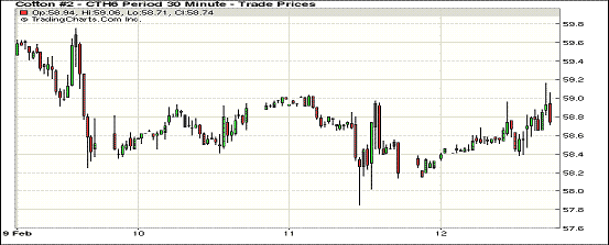 2月12日紐約期棉市場漲跌互現(xiàn),5月合約持倉量超越3月合約。1603月合約結(jié)算價58.90美分/磅,漲48點;主力1605月合約收于58.64美分/磅,跌7點。當日市場上半場交易相對清淡,主力5月合約盤中走高,但在挑戰(zhàn)59美分失敗后遭遇賣盤打壓從高位回落,最終以微幅下跌收盤。據(jù)路透社報道,土耳其在展開為期一年的調(diào)查后得出結(jié)論,美棉對土耳其形成傾銷,損害了土耳其國內(nèi)棉花生產(chǎn),美國方面則認為美棉對土耳其出口未形成傾銷,雙方還將就此問題進行進一步溝通。