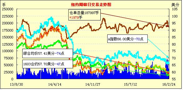 25日紐約期棉繼續(xù)下跌,主力合約跌破58美分/磅;1605月合約結(jié)算價(jià)57.41美分/磅,跌59點(diǎn);1607月合約收于57.34美分/磅,跌97點(diǎn)。當(dāng)日5月合約創(chuàng)下新低,最低價(jià)57.26美分/磅,雖然之后合約在底部支撐下反彈略有上漲,但市場情緒悲觀使期價(jià)難以回到漲幅區(qū)間。周三美股指及原油價(jià)格盤中走低,鄭棉走弱,紐約期棉下跌。同時(shí)登記庫存繼續(xù)增加,預(yù)示目前市場供應(yīng)寬松,且遭遇拋儲(chǔ),因而棉價(jià)繼續(xù)受壓。
