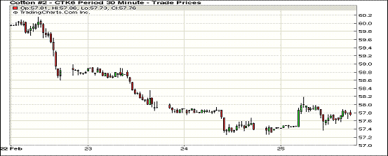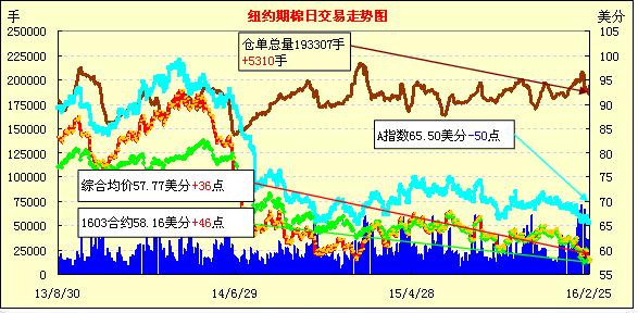 2月25日,紐約期棉觸底反彈,棉價(jià)小幅上漲;1605月合約結(jié)算價(jià)57.76美分/磅,漲35點(diǎn);1607月合約收于57.61美分/磅,漲27點(diǎn)。當(dāng)日近月合約開盤后走勢平穩(wěn)但略有上漲,5月合約最高沖上58.19美分/磅。2月12-18日一周,美棉簽約出口量回落,陸地棉簽約2.5萬噸,較前一周下降。但原油價(jià)格反彈、美股走高帶動(dòng)紐約期棉上漲。