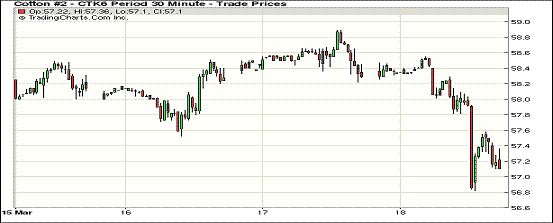 3月18日,中國明確4月中旬拋儲,同時美元指數(shù)上漲,CRB指數(shù)下跌;1605月合約收于57.16美分/磅,跌120點;1607月合約收于57.06美分/磅,跌123點。當日紐約期棉平開,早間小幅上漲,之后遭賣盤壓力大跌。當日主力合約跌幅超2%,并將本周漲幅全部回吐。本周棉業(yè)發(fā)展會議中公布了部分拋儲方針,中國低價拋儲可能導致對進口棉、紗的需求放緩,從而繼續(xù)影響國際市場棉花消費,對國際棉價與紗價構(gòu)成壓力。